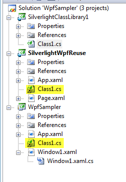 21: } 22: } 23: } Now in my Silverlight project and my WPF application I add a linked file to that class library for customer. While not binary compat, each time I compile I’m using a common source compat for both projects. Here’s what my project structure looks like and you can see the linked source code: